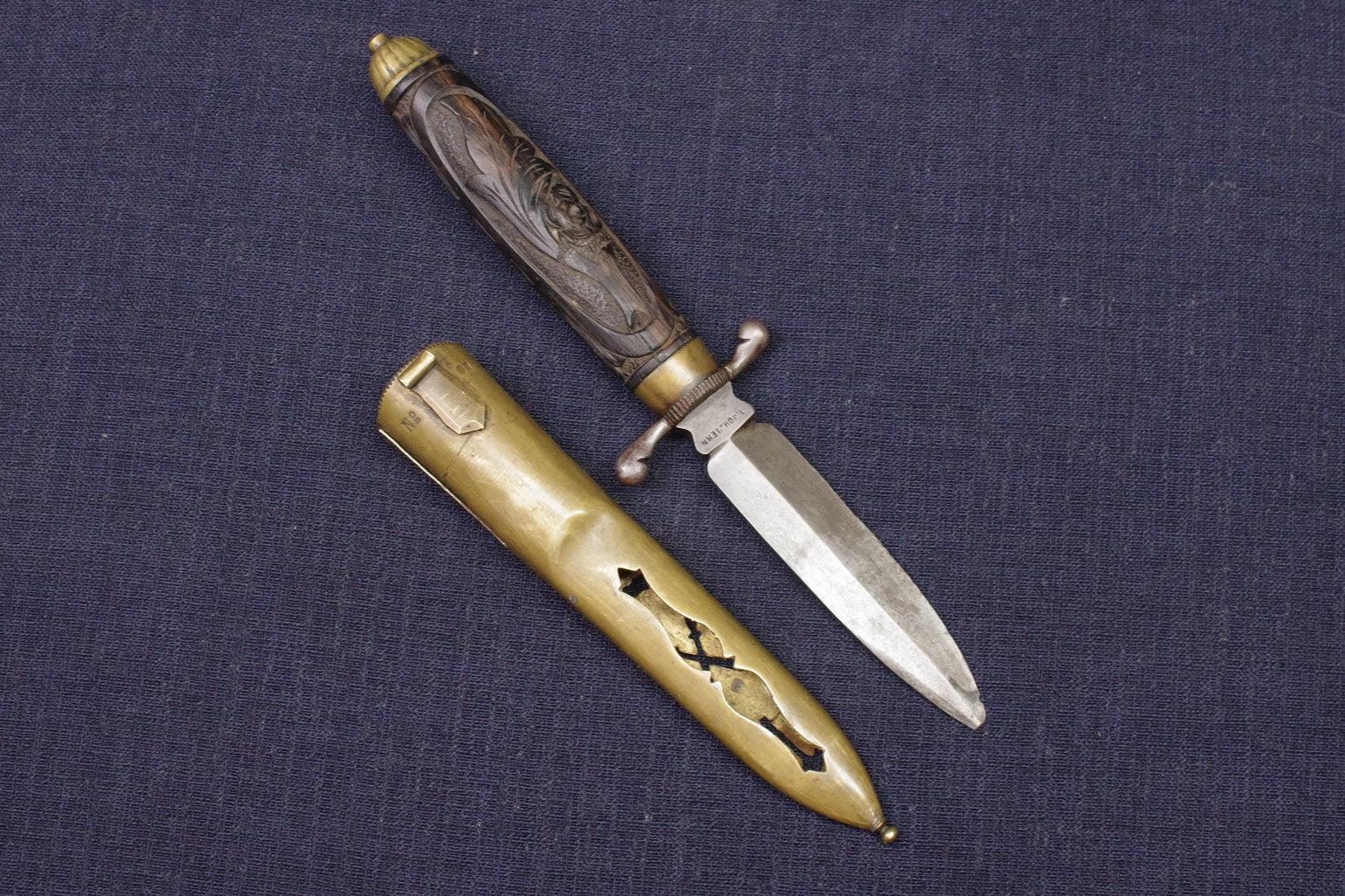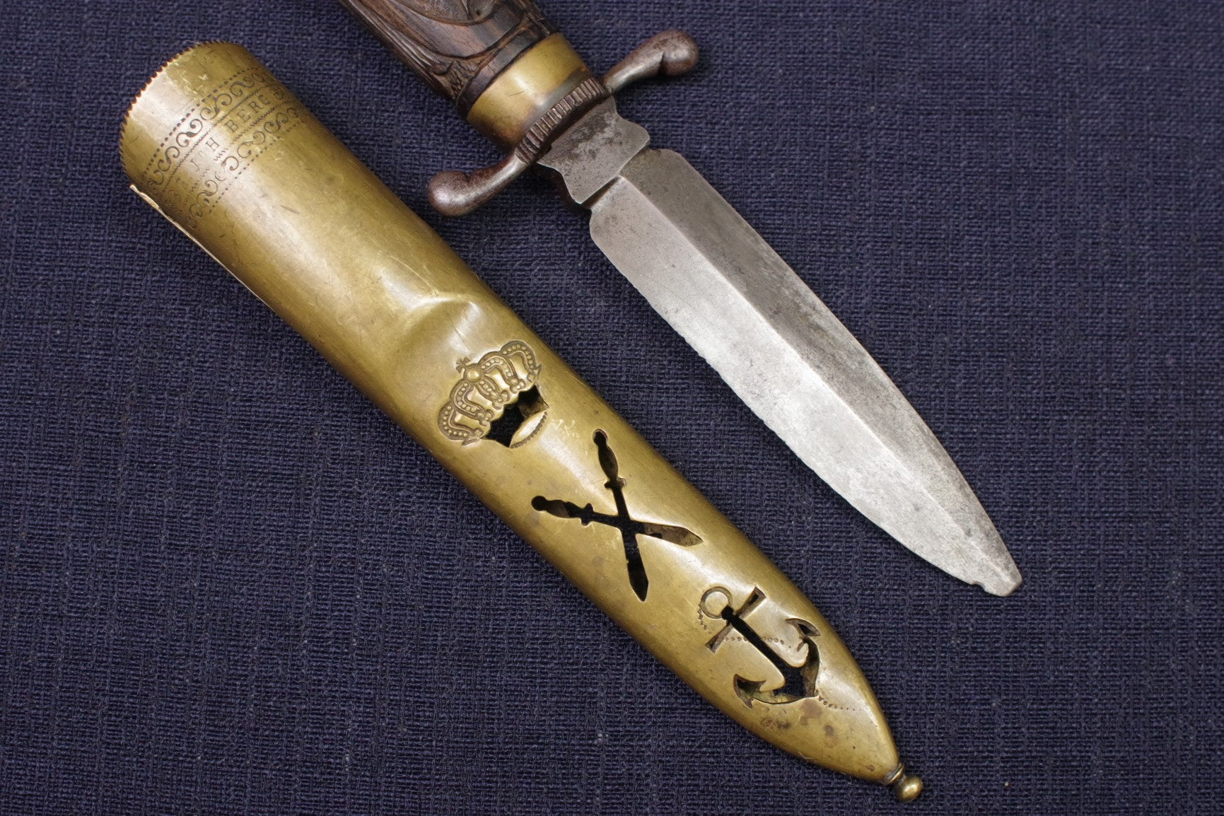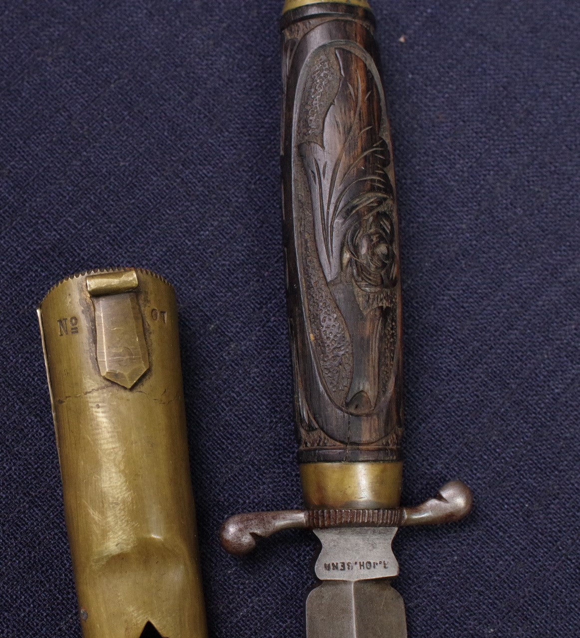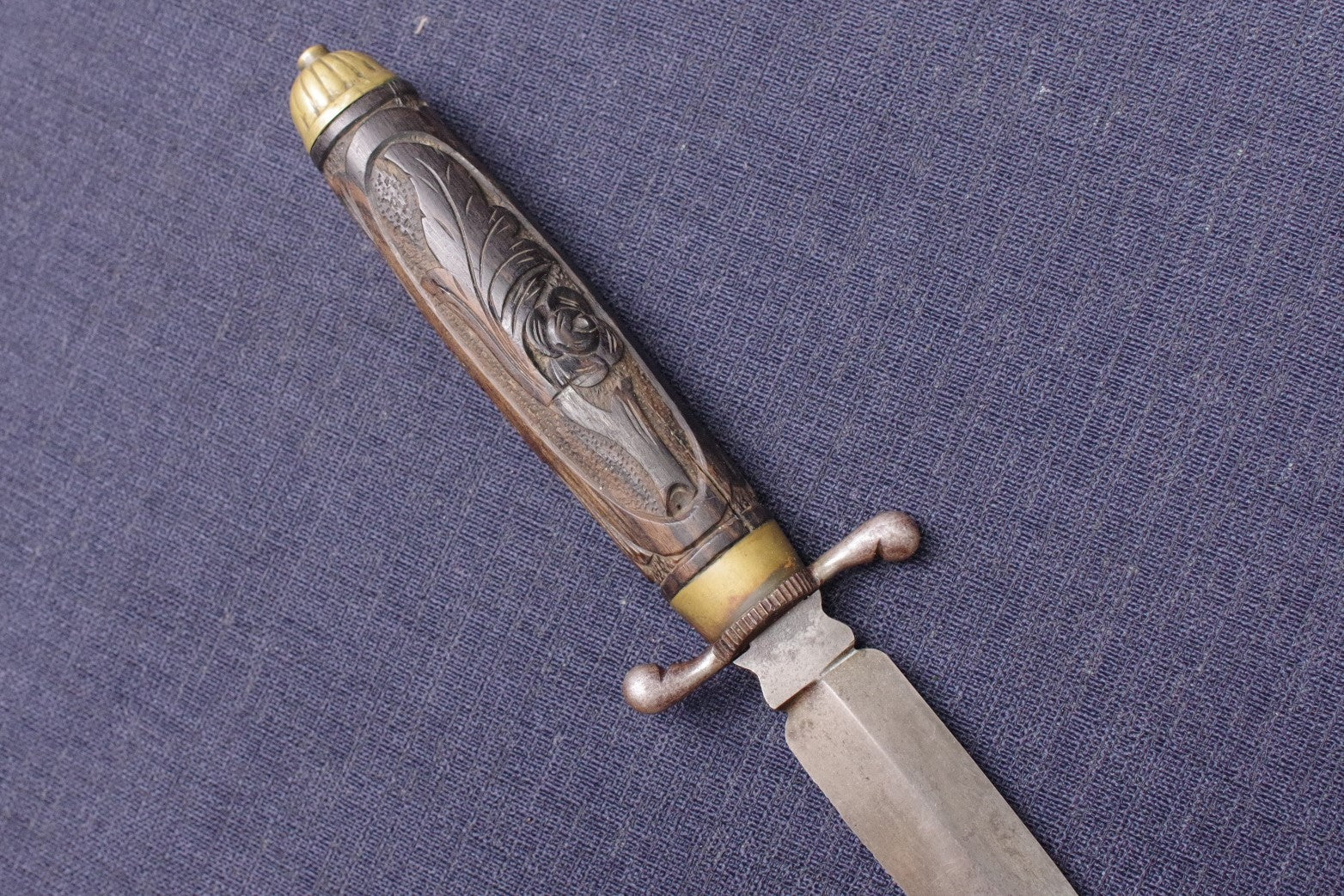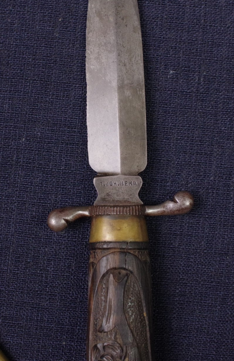 This interesting Swedish sailor's work-knife or svensk sjömanskniv, was manufactured by the Eskilstuna cutler Gustaf Johan Berg (company was in existence ca.1863-1891). Knife is 20.5 cm long, with a 9.5 cm blade, maker-marked on the ricasso and the brass scabbard, which is also stamped with a model No.7. Knife has a very-nicely carved ebony handle; the high relief scrimshaw depicts budding flowers and tobacco leaves in vignettes, on both sides. Point is blunted, and the blade has a nice uniform patina.