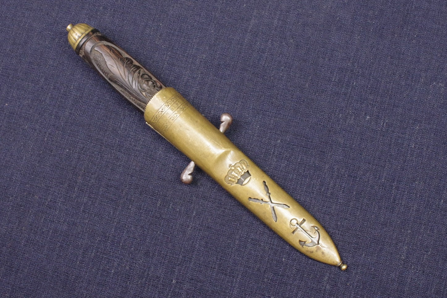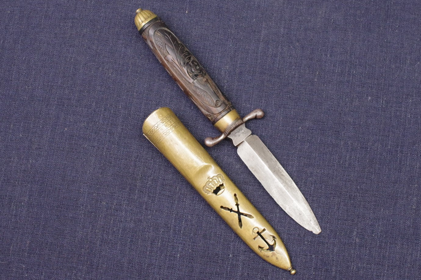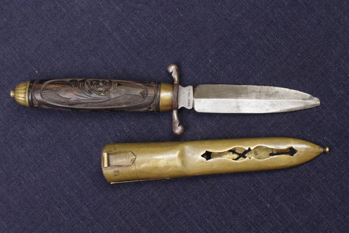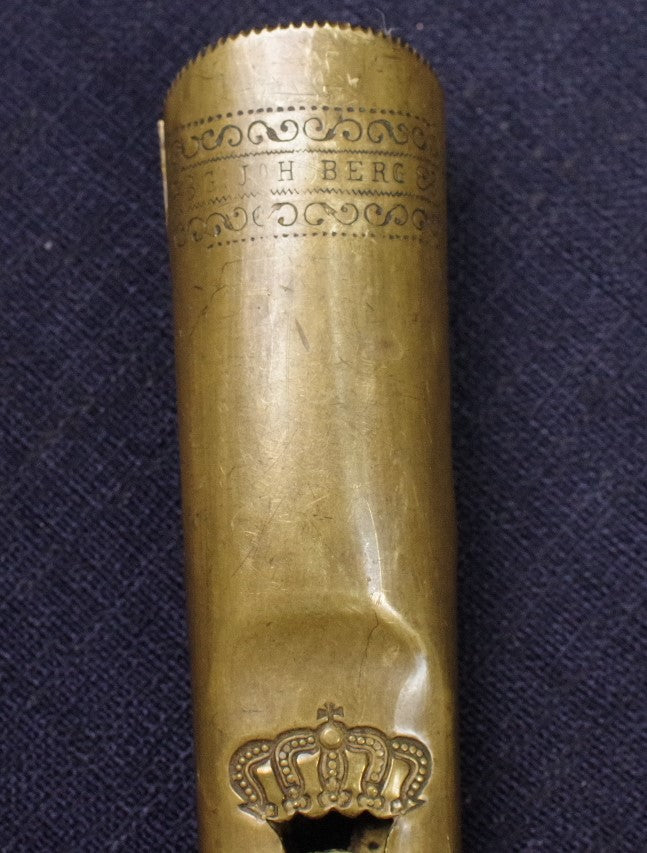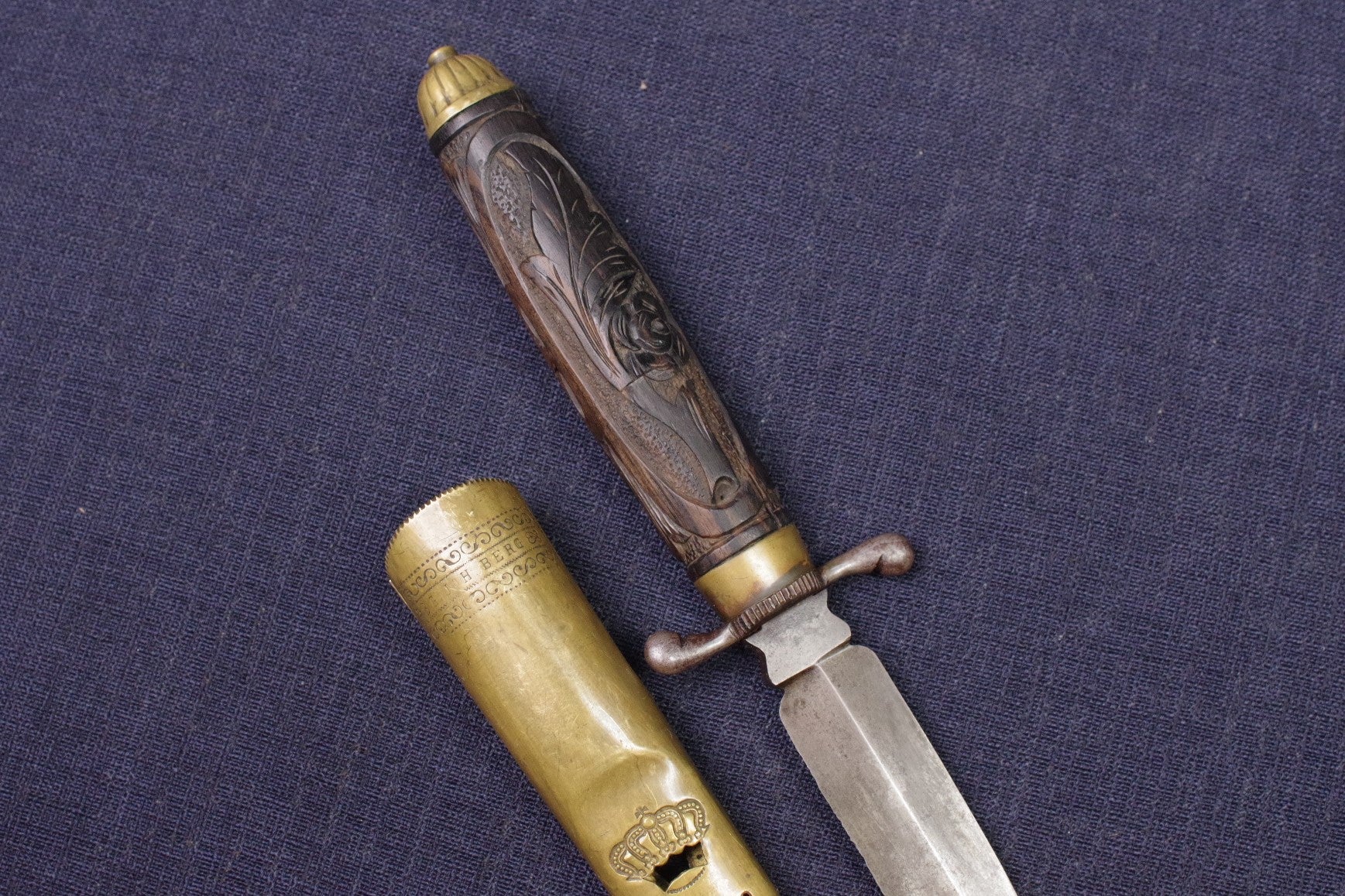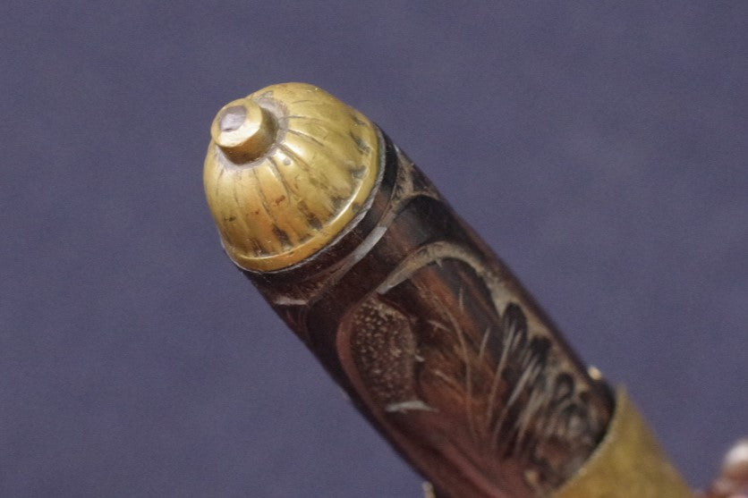 This interesting Swedish sailor's work-knife or svensk sjömanskniv, was manufactured by the Eskilstuna cutler Gustaf Johan Berg (company was in existence ca.1863-1891). Knife is 20.5 cm long, with a 9.5 cm blade, maker-marked on the ricasso and the brass scabbard, which is also stamped with a model No.7. Knife has a very-nicely carved ebony handle; the high relief scrimshaw depicts budding flowers and tobacco leaves in vignettes, on both sides. Point is blunted, and the blade has a nice uniform patina.
